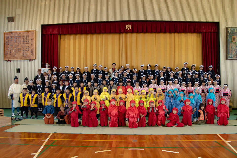 子ども奴は、益田児童館が地元の力で大行司小行司を行いたいと伝統文化の継承に取り組み、益田小の五・六年生を中心に七十名で組織。九月から津和野町の保存会の指導を受け、奴独自の歩き方や振り付けなどを練習してきました。