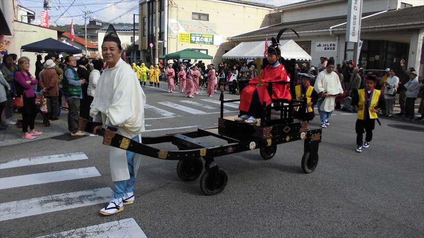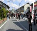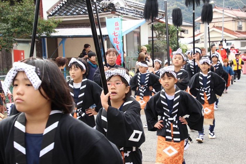 平成28年11月3日晴れ、子ども奴道中は27回目の出陣をしました。益田小学校児童約80名が、正午前に小学校横の折戸交差点に集結、佐々木益田小学校校長先生の激励の挨拶を受け、折戸交差点から本町通りを通り、JAいわみ前交差点を右折し七尾城通りを三宅御土居まで行き、そこでまた折り返し、JA前交差点を右折し、メイン会場の本町通りから幸町通りを経て益田児童館にかえるコースで多くの演技をし、行進しました。沿道では多くの観客が見守り、子どもたちの勇壮な演技に応え、多くの賞賛を頂きました。 大変素晴らしい演技でした。ご声援ありがとうございました。