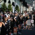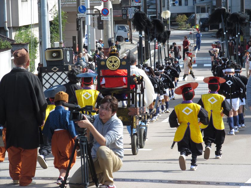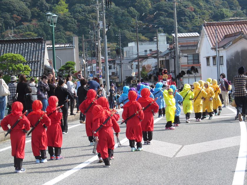 平成29年11月3日晴れ、子ども奴道中は29回目の出陣をしました。益田小学校児童約100名が、正午前に小学校横の折戸交差点に集結、佐々木益田小学校校長先生の激励の挨拶を受け、折戸交差点から本町通りを通り、JAいわみ前交差点を右折し七尾城通りを三宅御土居まで行き、そこでまた折り返し、JA前交差点を右折し、メイン会場の本町通りから幸町通りを経て益田児童館にかえるコースで多くの演技をし、行進しました。沿道では多くの観客が見守り、子どもたちの勇壮な演技に応え、多くの賞賛を頂きました。 大変素晴らしい演技でした。ご声援ありがとうございました。
